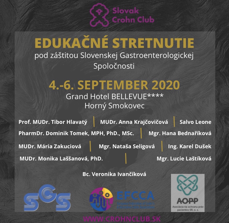 Pozývame vás na edukačné stretnutie 4.9.-6.9. 2020 v Grand Hotel Bellevue v Hornom Smokovci. Ak máte záujem, napíšte nám na: predsednictvo@crohnclub.sk a pošleme vám detaily stretnutia.Tešíme sa na vás!